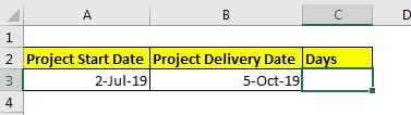 Aquí la fecha posterior es la fecha de entrega del proyecto y la fecha anterior es la fecha de inicio del proyecto. Entonces, si implementamos la fórmula genérica anterior, obtendremos esta fórmula: