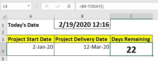 En la solución anterior, calculamos los días entre la fecha de inicio y la fecha de entrega. Pero si desea crear una función para cuenta atrás los días restantes antes de la fecha de entrega del proyecto, entonces no funcionará. La solución es la función HOY. Vamos a ver cómo.