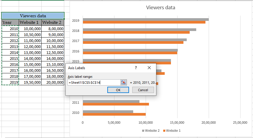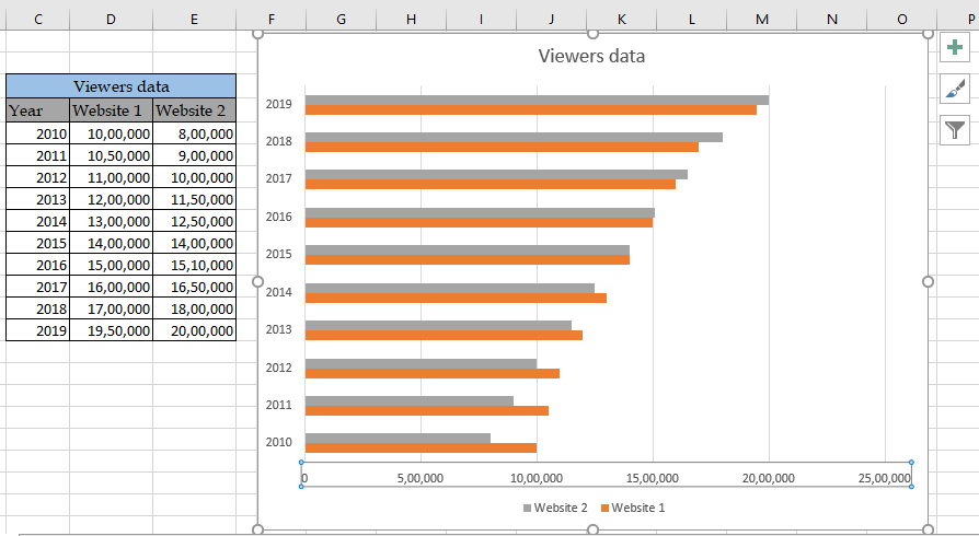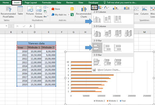 All of these might be confusing to understand. Let's understand how to demonstrate data in a clustered bar chart in Excel. Here we have data where we need to compare the viewers of two websites on a year wise basis in a clustered 2D chart.