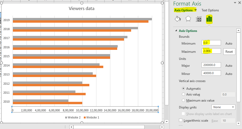 is expanded by changing these bounds. For the range to be shown in millions. Select the Display units to millions from None. Display unit option will be under the Format axis option below the Bounds option we just used.