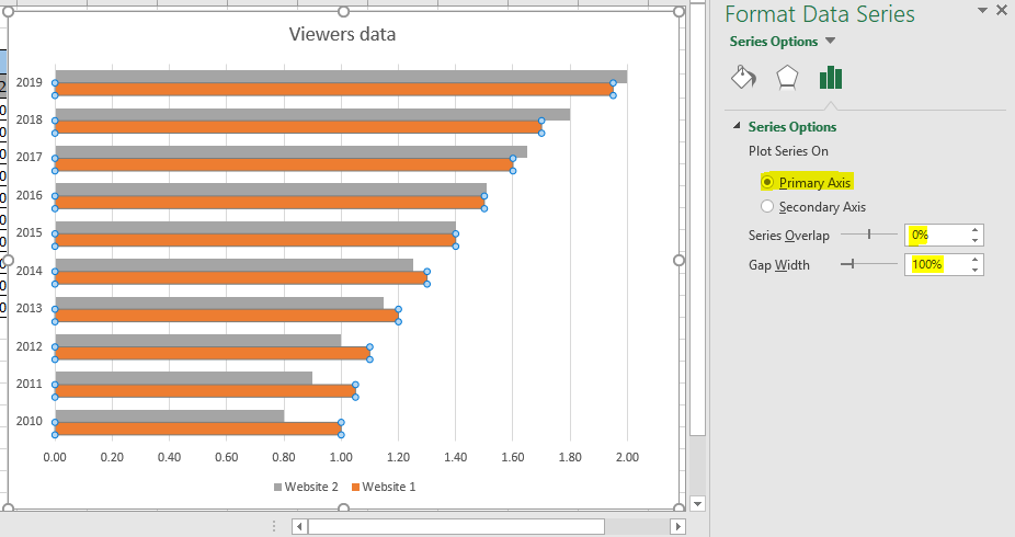 And select the Primary Axis option from the Series Options. Edit the second bar if required. As you can see the Bars Width and Gap Width are adjusted according to chart size.