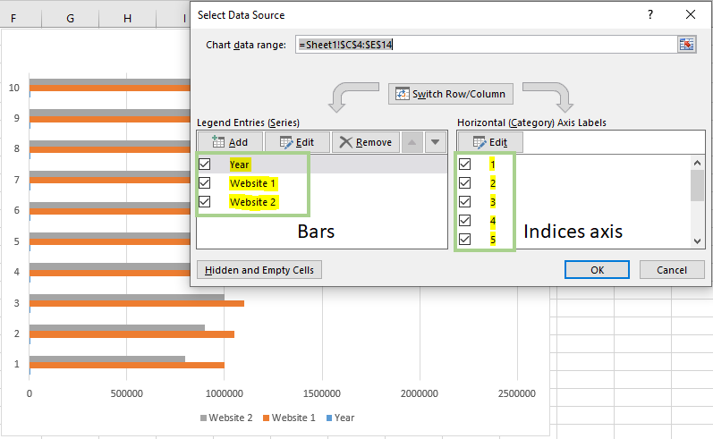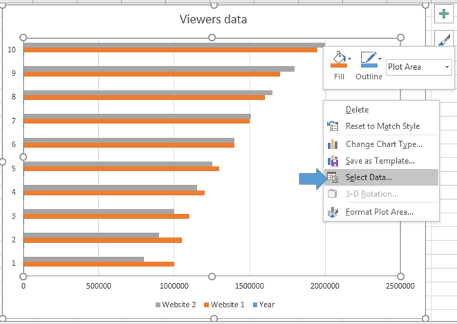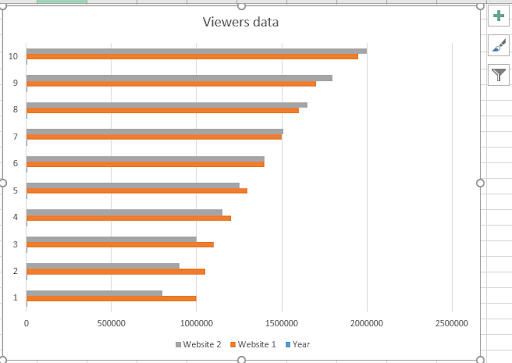 You will get a chart having a chart representing 3 datasets with indices 1 to 10 in the vertical axis. We need a chart representing two datasets on a year basis. But here the bars represent the year, website 1 viewer, website 2 viewer in chart selected.