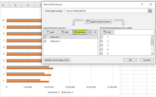 Clicking the option will display a Select Data Source dialog box. This box shows the data represented on the bars on the left and horizontal axis indices on the right. First we need to remove the third type of bars which is years.