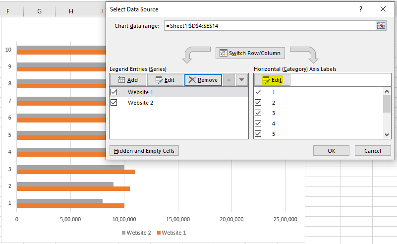 As you can see now there are only two datasets as bars. Now we will edit the indices with year values. Select the Edit button.