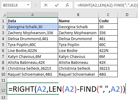 FIND(",",A2) : Here the FIND function looks for the position of the search string comma (",") in cell A2 (Georgina Schalk,30). It returns 16. Now the formula is =LEFT(A2,16-1).