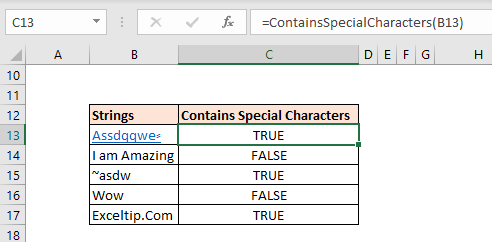 It returns TRUE for the first string since it contains a special character. When you copy the formula down it shows FALSE for B14 string and so on.