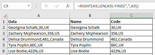 All of these might be confusing to understand. Let's understand how to use the function using an example. Here We will use the same data that we used in the above example. This time we need to extract codes from the string. The codes are on the right of the comma (","). Let's use the above generic formula to split text from right.