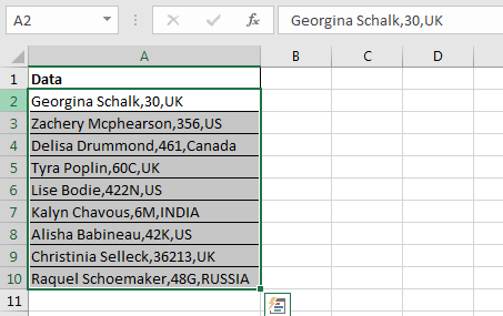 Using the above formula, we can only separate text on the first appearance of specific text in the string. If there were multiple commas at random places in text, the above formula would be useless. We will have to use more formulas and that would be tedious. How do we split text on each appearance of a specific character?