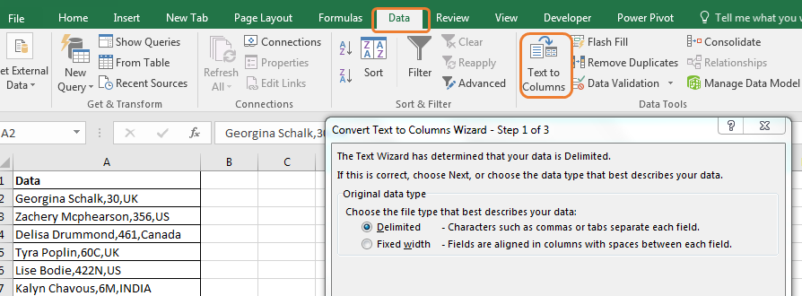 Press ALT>A>E. This will open the Convert Text to Column Wizard box. You can also go to Data> Text to Column, in the ribbon tab.