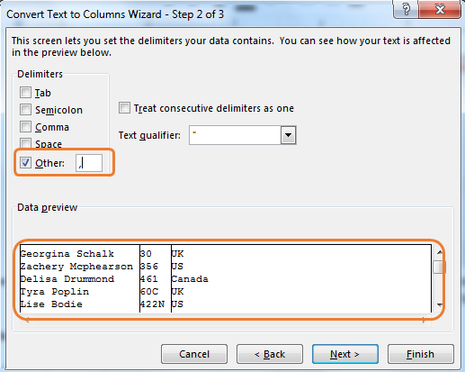 Here we will split text using comma separators. We can select the comma check box, but here we will use the Other option. In another option, you can write any text to split text at. We will write a comma.