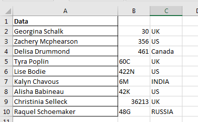 All of these might be confusing to understand. Let's understand how to use the function using an example. Here I have this simple data set. In range A2:A1, we have names and codes concatenated with a comma (",") and space characters (" "). The name is on the left of comma and I want to split it from each text.