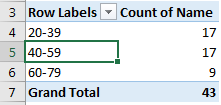 We can see that every age is listed here. We can see how many employees are of which age. But this not what we want. Right? To group them into intervals of 20 years, right click on any age label and click on group.