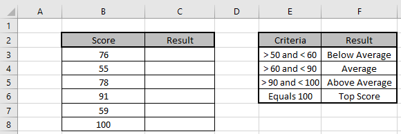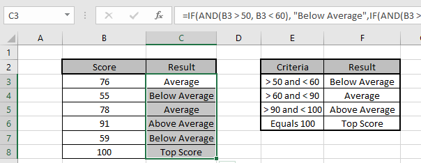=IF(AND(B3 > 50, B3 < 60), "Below Average",IF(AND(B3 > 60, B3 < 90),"Average",IF(AND(B3 > 90,B3< 100),"Above Average","Top Score"))) |