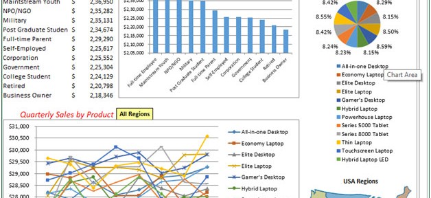The picture below shows quarterly sales by product and region and is linked through a dropdown list. On the selection of any region, the related information will be updated dynamically.