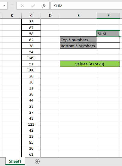 Firstly,  we need to find the top Five values using the LARGE function and then sum operation be performed over those 5 values. Now we will use the following formula to get the sum