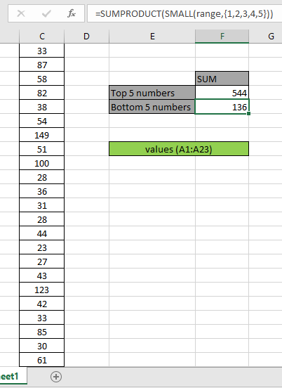 • SUMPRODUCT function gets the array of bottom 5 values, which has an array of bottom 5 numbers returns the SUM of those numbers.